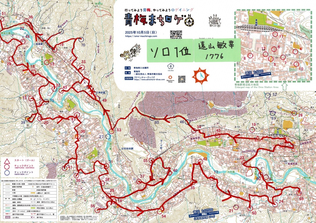 2025年大会 上位入賞チームのルート紹介 青梅まちロゲ ブログ 2025.10.07 2025年大会の上位入賞チームのルートを紹介しています。「こんな回り方があるんだ!」と参考になると思いますので、ぜひご覧ください。 ソロチーム ソロ1位 ソロ2位 ソロ3位 特別賞ソロ女子1位 一般チーム 一般1位 一般2位 一般3位 ファミリーチーム ファミリー1位 ファミリー2位 ファミリー3位